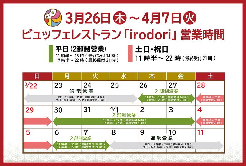 3月 6, 2026 / 最終更新日時 : 3月 6, 2026 Fieldnakano Uncategorized ビュッフェレストラン「irodori」:春休み間の営業についてのご案内 FacebookXBluesky