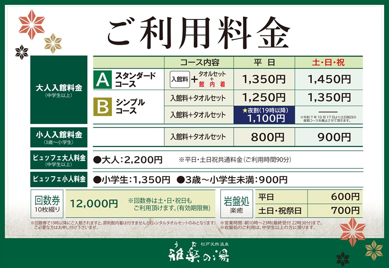 ■有効期限のある「優待券(全日・平日)」、また、スタンプ入館の場合、館内着がご不要でもスタンプは押印できませんので予めご了承くださいませ。